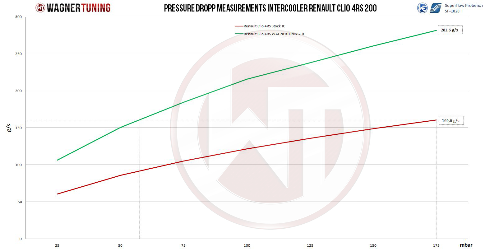 Uw Renault Clio 4 R.S. (Trophy) verdient het beste - en dat is precies wat de Wagner Tuning high-performance inlaatluchtkoeler biedt. Met een revolutionaire Competition kern (Tube Fin) biedt deze intercooler een dimensie van prestaties en efficiëntie die u zal imponeren. De afmetingen van 300 mm x 222 mm x 125 mm [getrapt] resulteren in een royaal extern intercooler kernvolume van 7,7 liter. Resultaat? Een 16% groter frontaal stroomgebied en maar liefst 113% meer extern intercooler kernvolume vergeleken met de standaard intercooler. Engineering voor maximale prestaties! Onze gegoten aluminium eindkasten zijn nauwkeurig ontworpen in CAD en geperfectioneerd door CFD-simulaties met optimale interne luchtstroom. Het resultaat? Uitstekende koelprestaties met minimale tegendruk. Deze kit is speciaal ontworpen voor racen om optimale koeling van de inlaatlucht en een aanzienlijke toename van de prestaties te garanderen.Voordelen van de Wagner Tuning intercooler: